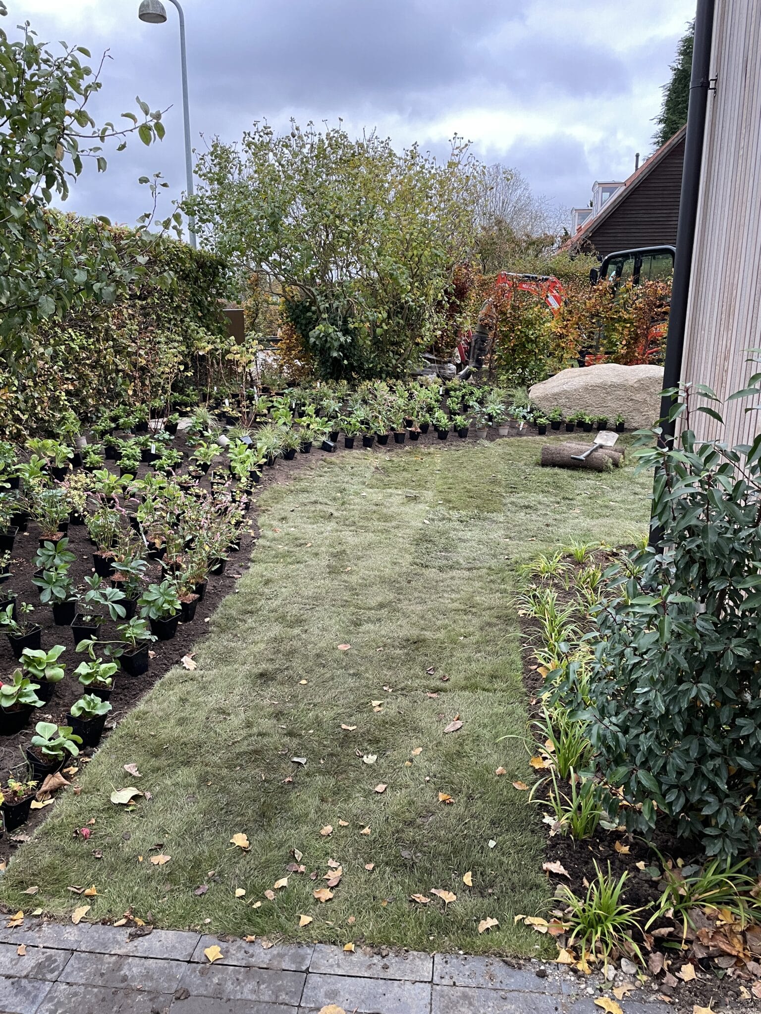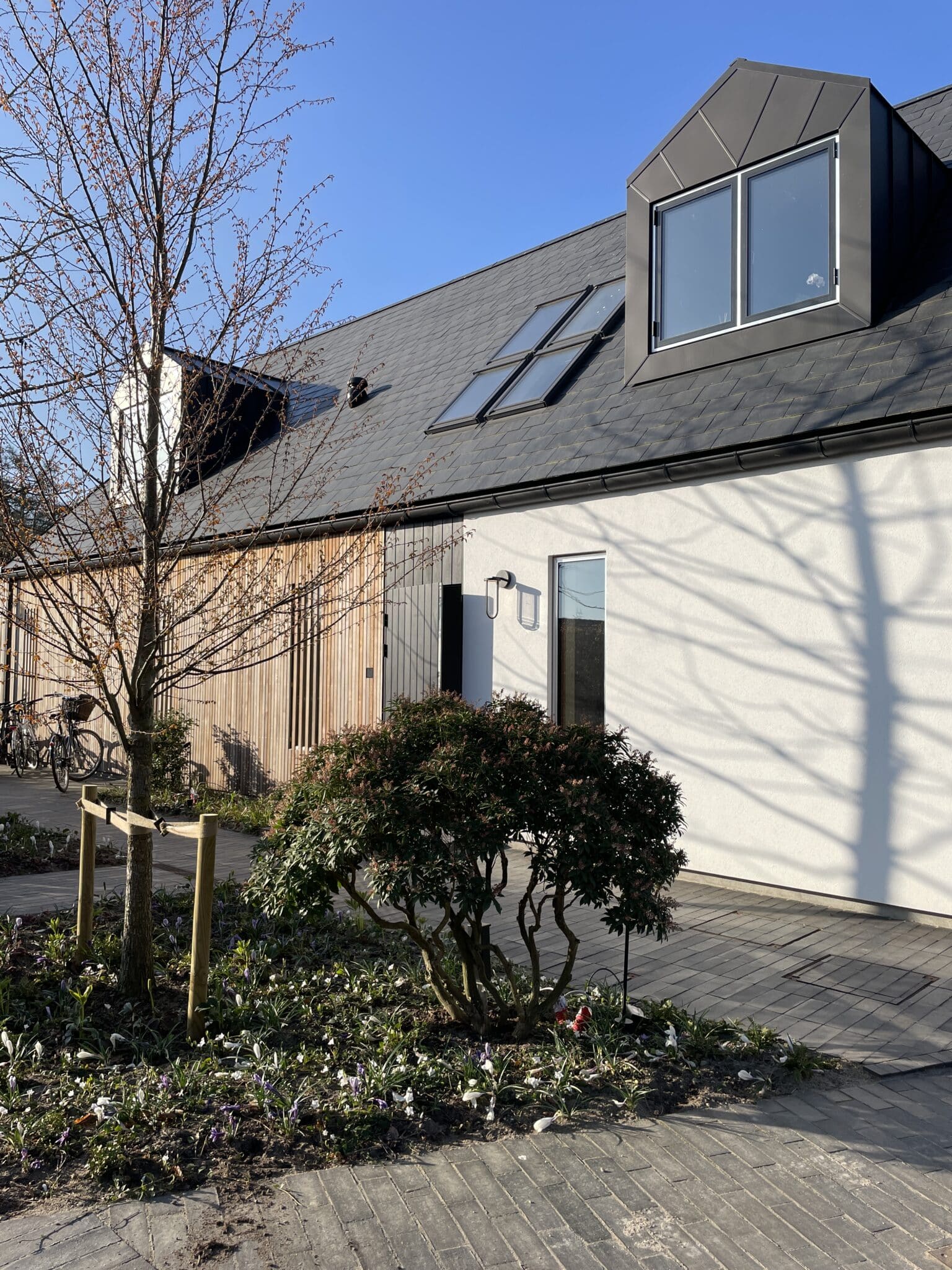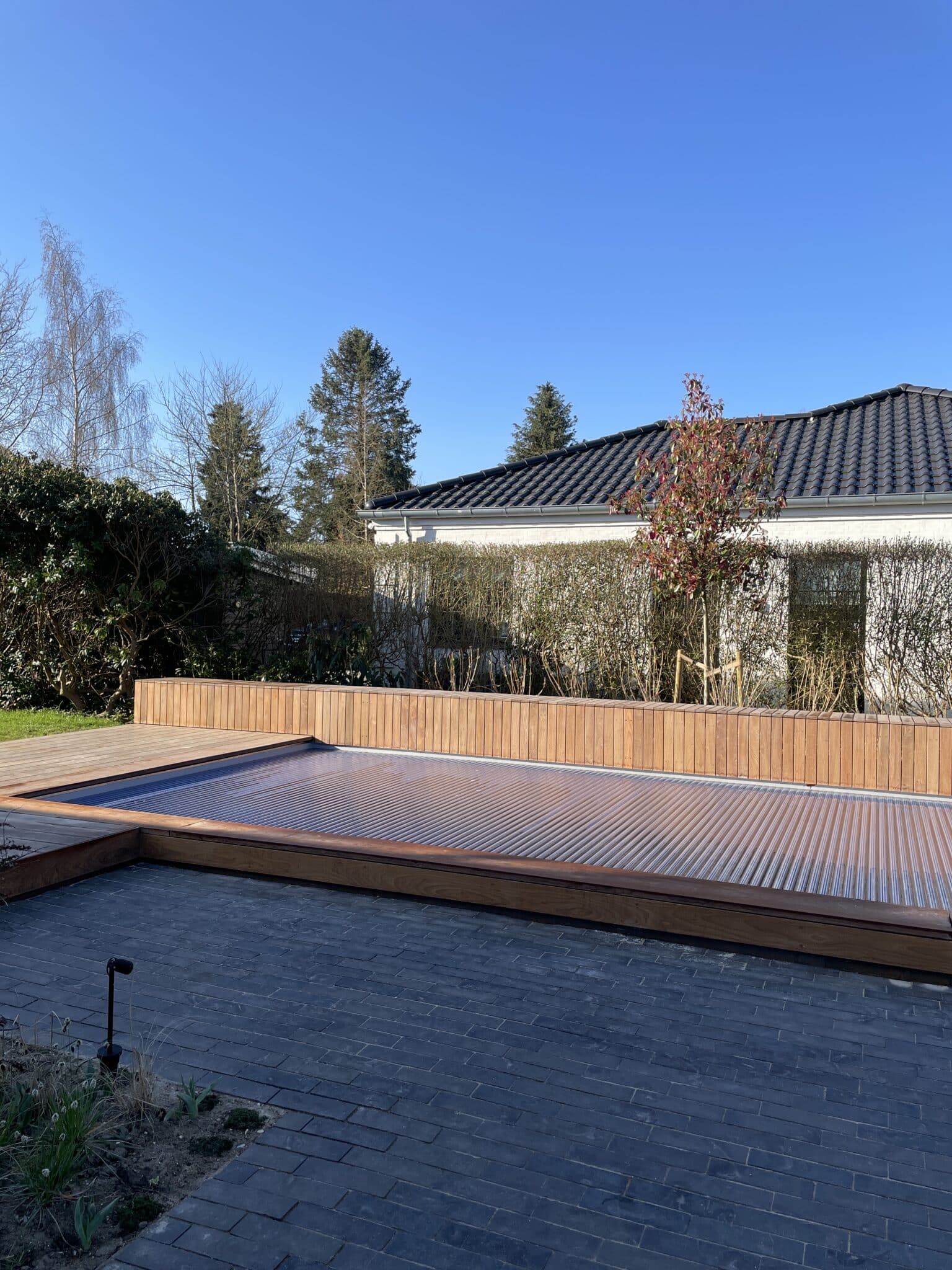 Til denne nyopførte villa med pool har LARKi Landskab tegnet et helt nyt haveanlæg med et imødekommende ankomstareal foran huset og et afskærmet gårdhavemiljø omkring den store pool bagved huset. Frodige plantebede med både blomstrende og stedsegrønne stauder, løg, træer og buske skaber opholdsrum og opdeler funktioner. Den sortbrune teglklinke er afstemt efter husets skifertag og det ubehandlede træ på facader, carport og terrassedæk. Det giver en afdæmpet og eksklusiv belægning med et smukt spil som skifter med lyset. Der er anvendt forskellige læggemønstrer som fuldender de fint udførte detaljer.