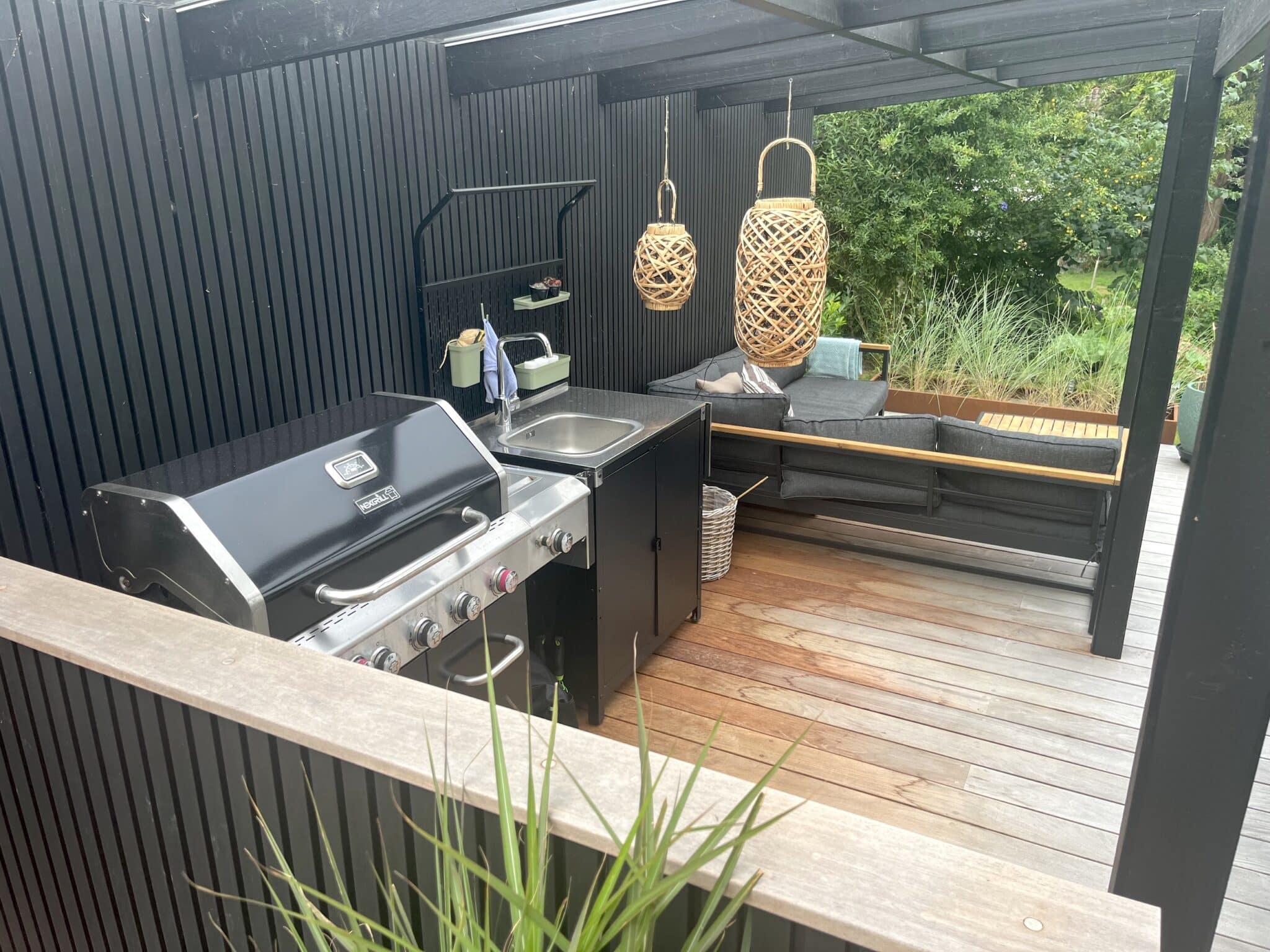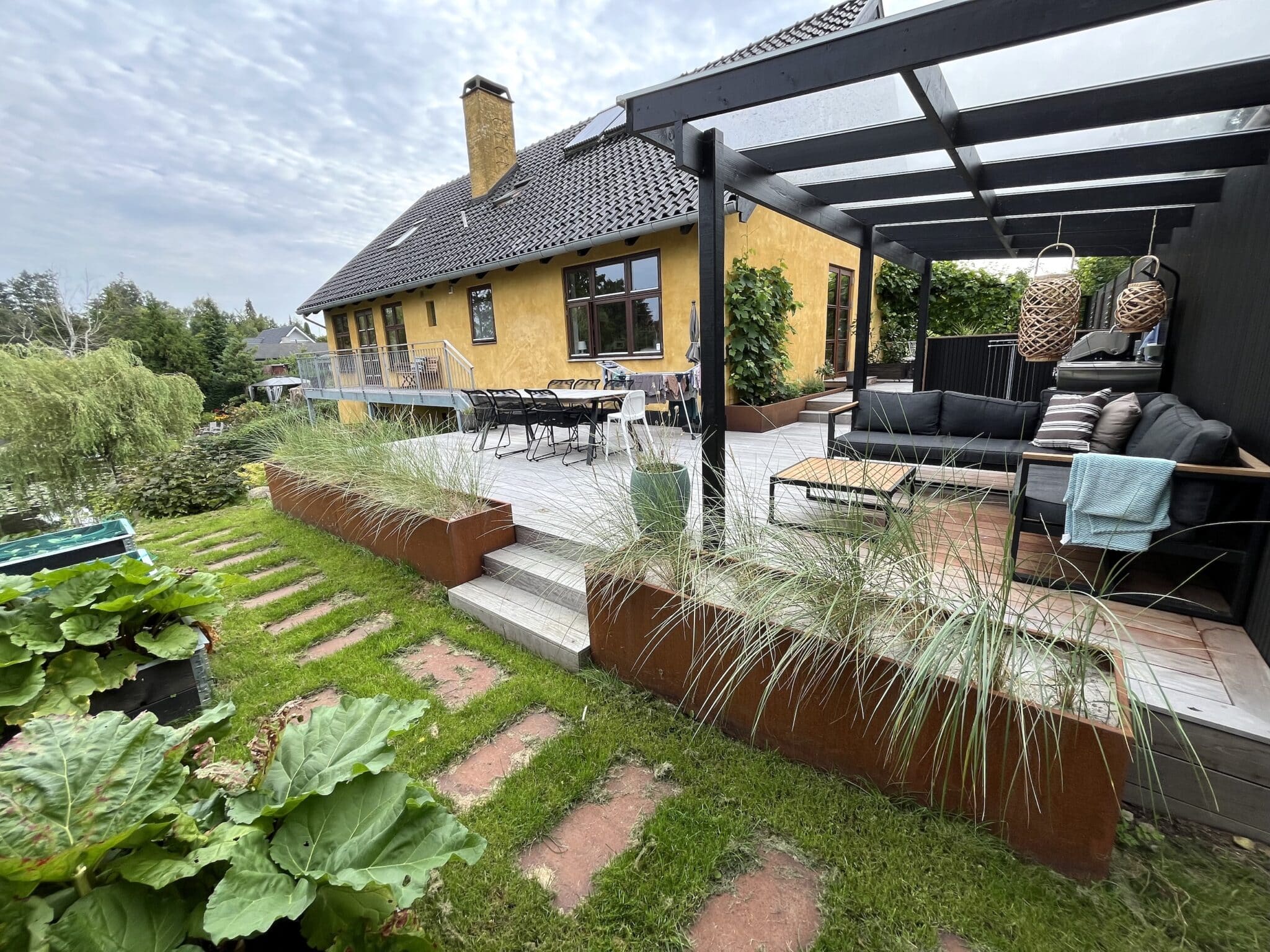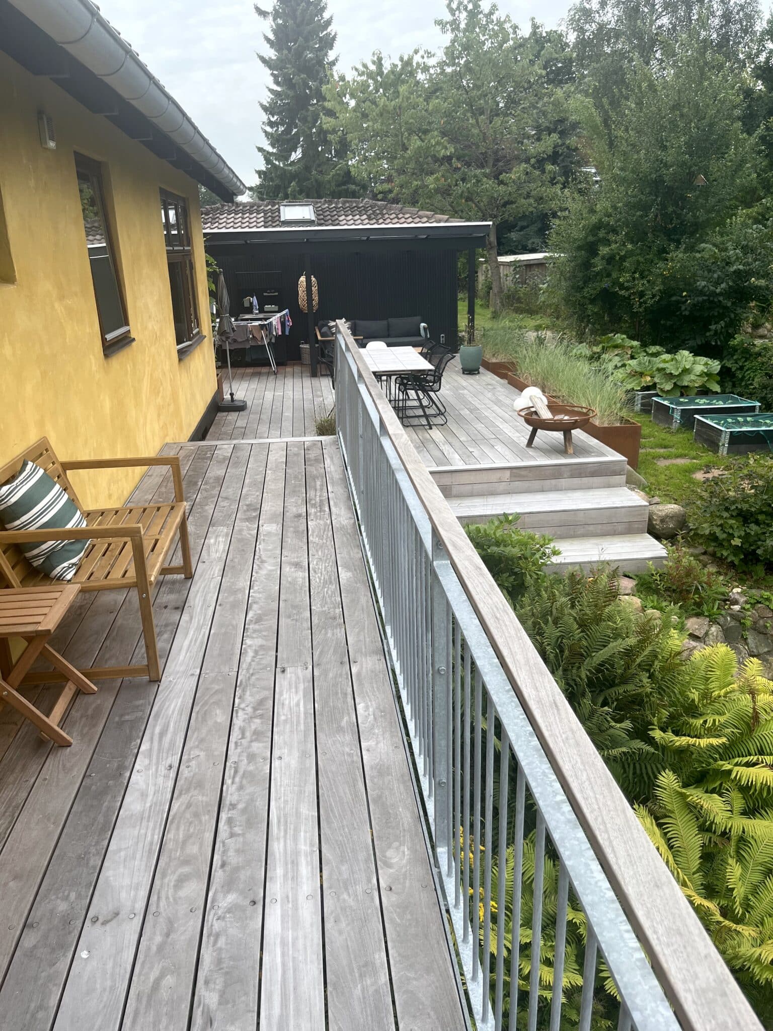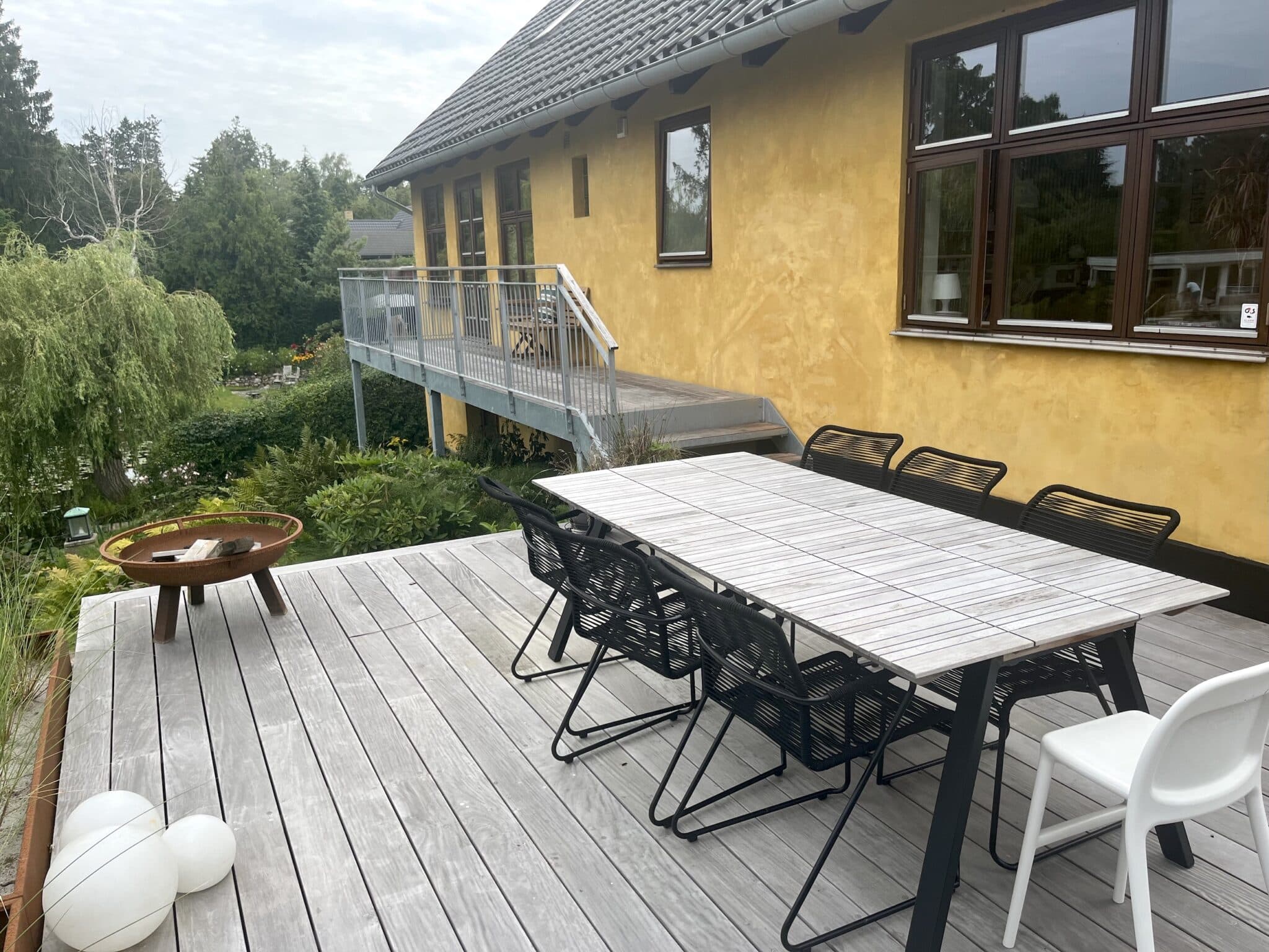 Fra udsigtsstuen er der tilføjet en udgang mod søen hvor en svalegang med plads til ophold. Svalegangens smukke trædæk smyger sig omkring huset og tilpasser sig det dramatiske terræn på grunden. Med omhyggeligt tegnede trin og terrasseflader er der skabt et levende og eksklusivt havemiljø som understøtter funktioner til spiseplads, overdækket loungeområde, udekøkken og hyggekrog i morgensolen. Alt er helt ugeneret og ligger med den skønneste udsigt ud over søen. Enkelt og lækkert.